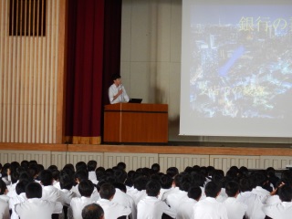 1年が夏休み中に実施した職業人インタビュー学習のまとめとして行っているプレゼンテーションのうち、選抜された各クラス代表の発表会を行いました。