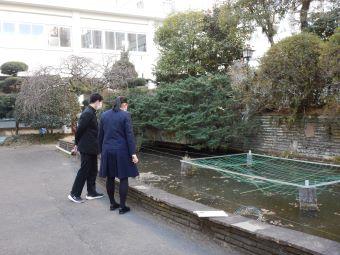 今朝、今季初中庭の池の水が凍っていました。昇降口前で活動していた校風委員会の生徒たちと少し持ち上げてみましたがしっかりと厚みがありました。
